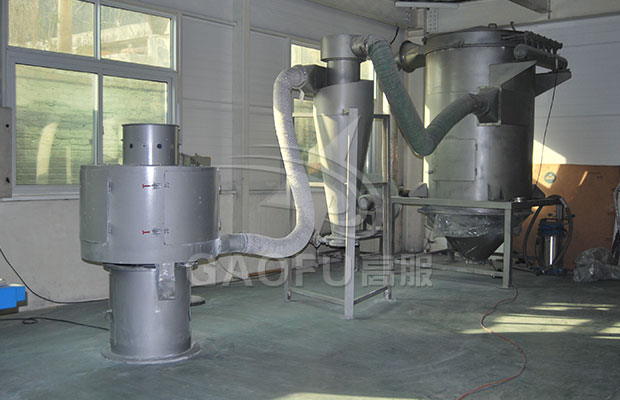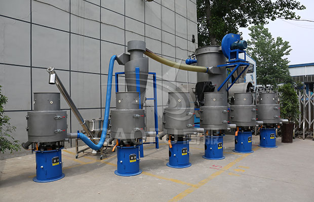 氣流篩串聯(lián)在高粉機(jī)與包裝機(jī)中,不但解決了篩分的問題,還解決了高粉機(jī)正壓冒出的粉塵問題。